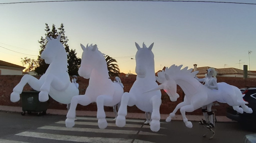 blanco nuclear y acompañados de caballos y unicornios de luz gigantes.
